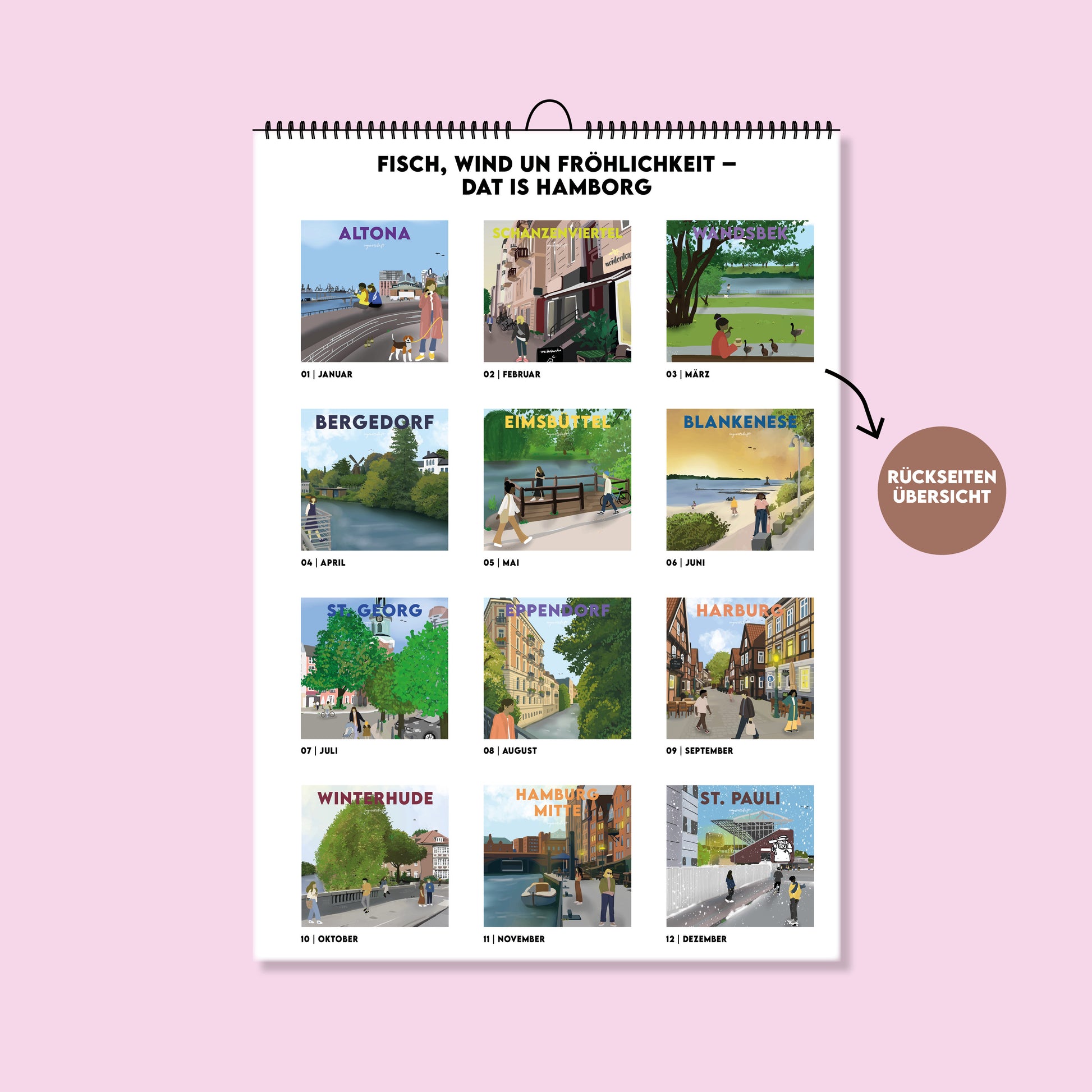 Unser A4-Heimatkalender Hamburg 2026 präsentiert 12 liebevoll handgemalte Motive von Hamburg. Jedes Bild wurde mit viel Hingabe und Liebe zum Detail gestaltet – perfekt, um dir das ganze Jahr über Hamburg Flair nach Hause zu holen! Von Januar bis Dezember 2026 begleiten dich die kunstvollen Seiten auf hochwertigem 160-Gramm-Offsetpapier. Dank der praktischen Spiralbindung kannst du ganz bequem durch die Monate blättern.