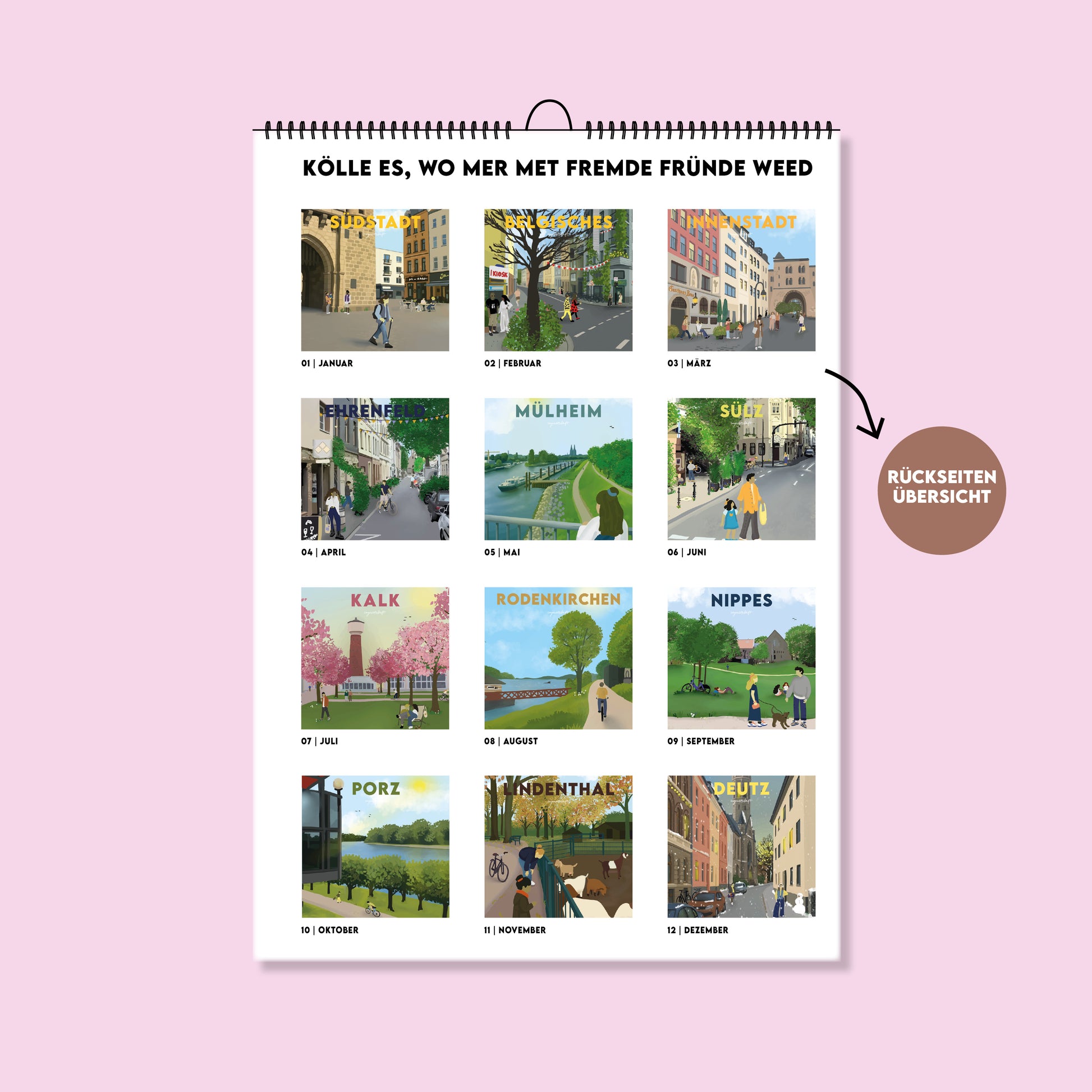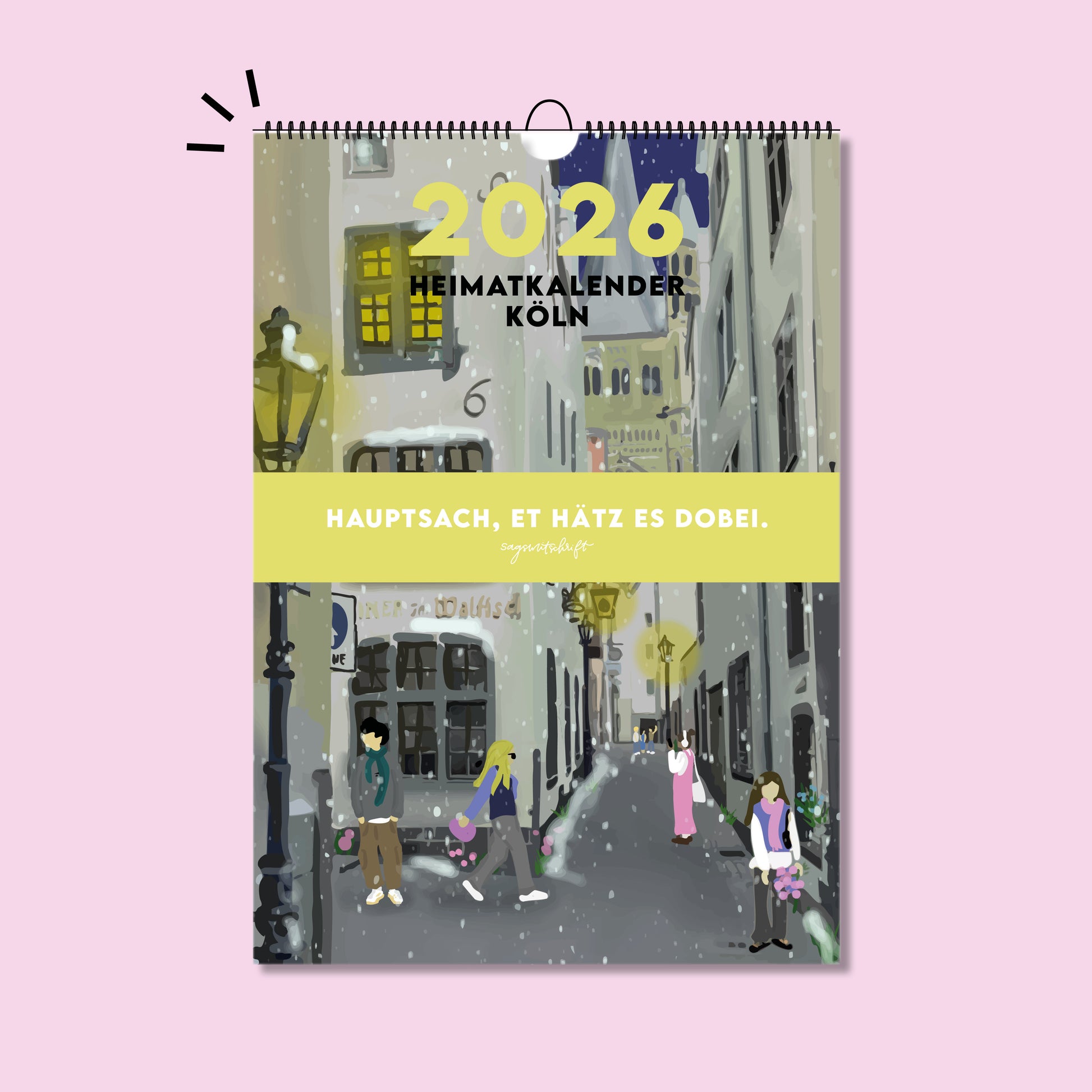 Unser A4-Heimatkalender Köln 2026 präsentiert 12 liebevoll handgemalte Motive von Köln. Jedes Bild wurde mit viel Hingabe und Liebe zum Detail gestaltet – perfekt, um dir das ganze Jahr über Kölle Flair nach Hause zu holen! Von Januar bis Dezember 2026 begleiten dich die kunstvollen Seiten auf hochwertigem 160-Gramm-Offsetpapier. Dank der praktischen Spiralbindung kannst du ganz bequem durch die Monate blättern.
